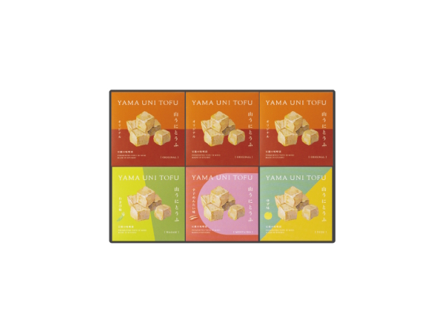 山うにとうふ40~50グラムプチサイズの6個セットです。贈答用化粧箱に入れてお届けします。