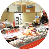 五木久領庵の1階は、「豆腐の味噌漬」や「山うにとうふ」などの当社自慢の商品や、 人吉球磨地域の名産品「球磨焼酎」、熊本県内の特産品が所狭しと並ぶ「お買い物処」。全国への発送も可能です。